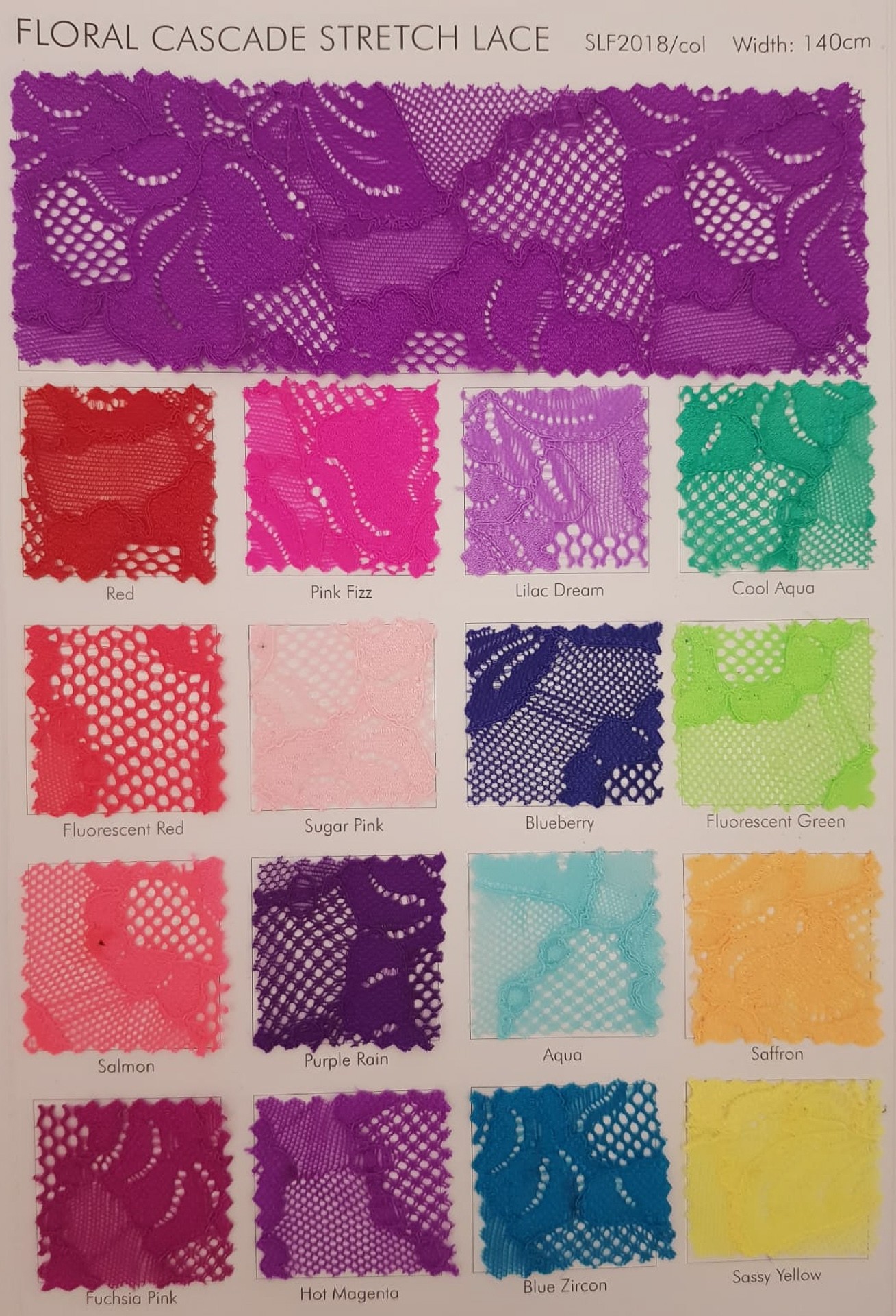 Dantela Elastica Floral Cascade Chrisanne, elastica pe amble parti, disponibila intr-o gama variata de culori. Latime: 1.5m