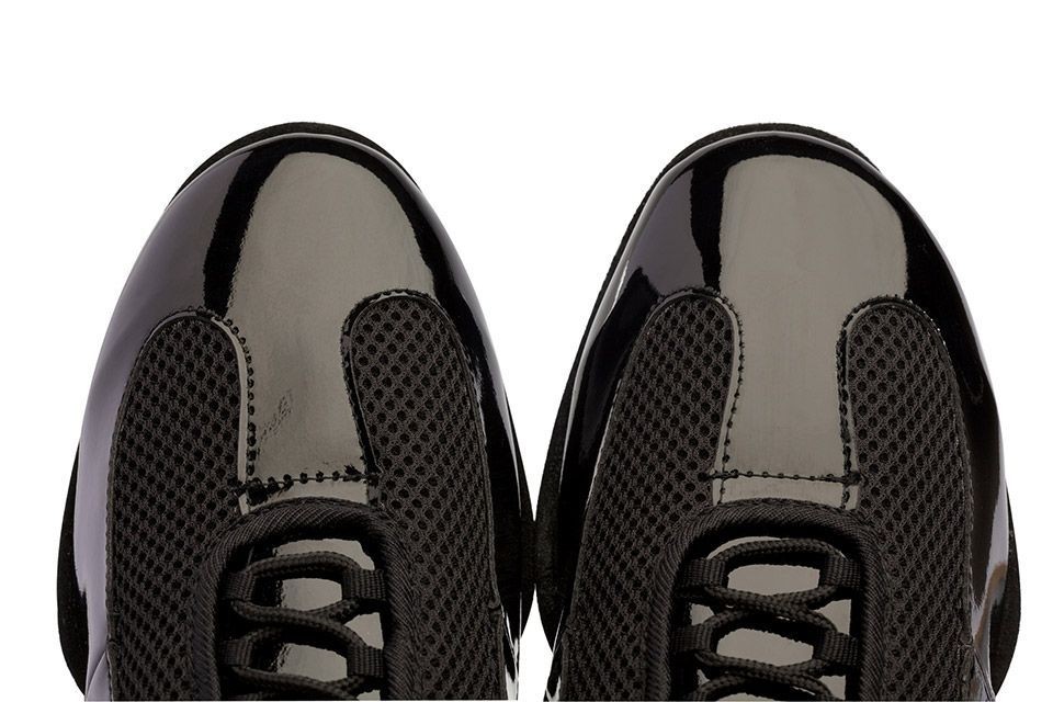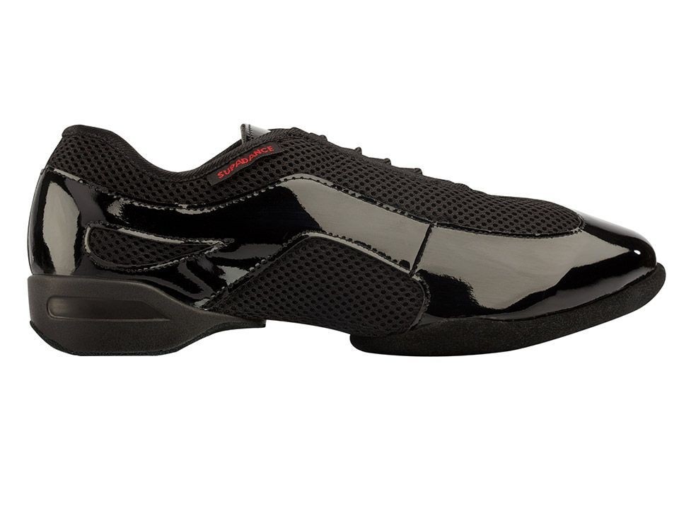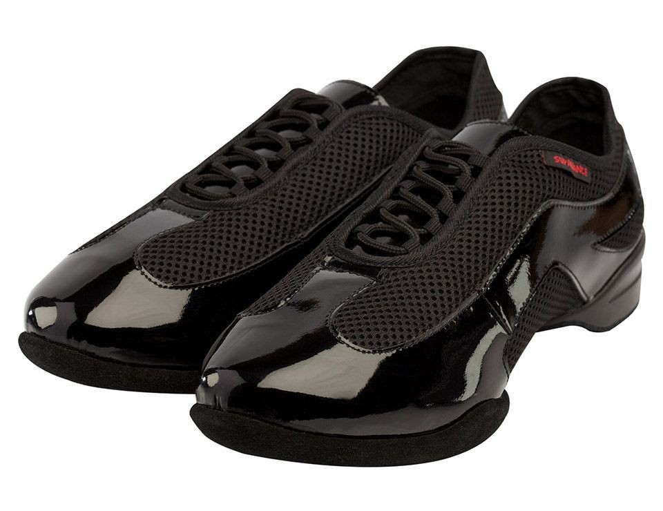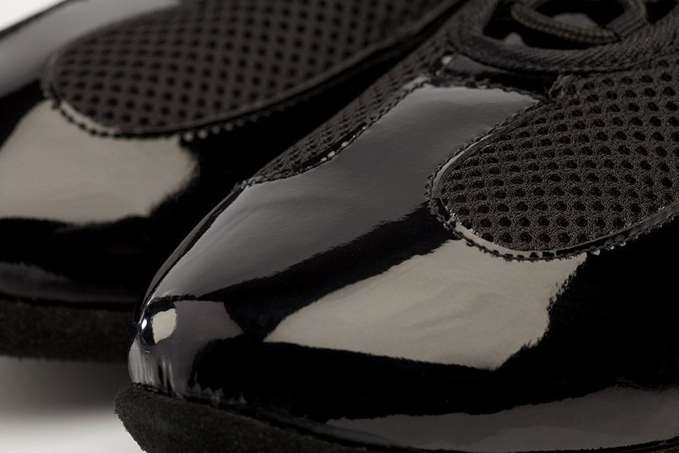 Piele lacuită neagră și material, talpă divizată, pantofi pentru antrenament. Căptușeală suplimentară din piele de căprioară pe exteriorul pantofului, pentru o protecție suplimentară. Talpa din piele de căprioară. Design nou, elegant, foarte moale și flexibil. Respirabil în toată partea superioară.